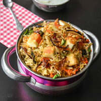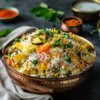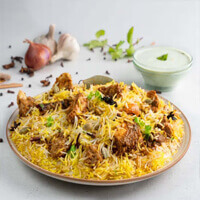 A delightful preparation of richly flavored aromatic rice layered with marinated chicken pieces in a delicate blend of whole spices.